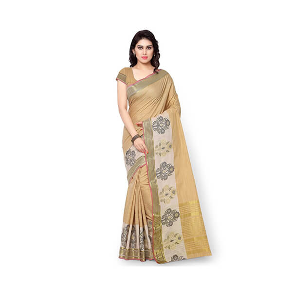 This cream banarasi silk saree has plain body and golden zari pattu border. It has got woven designer flower having off white background daman alon... view more